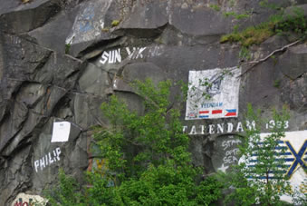 Als een cruiseschip hier de eerste keer komt, zorgt de kapitein voor een afbeelding op de rots met de naam van het schip. De rots staat er vol mee.