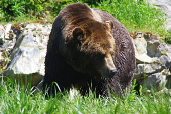 Bij een stukje water en een stuk bos stonden we plotseling oog in oog met een grizzly beer. We bleven doodstil staan om het dier goed op de camera’s te krijgen. Op zijn gemak kuierde hij weer het bos in. ( at he zoo of course :-) Ze proberen hier de beren zo goed mogelijk te beschermen, vooral tegen zichzelf. De handvatten van de openbare vuilnisbakken zijn zo gemaakt dat een beer het deksel niet kan openmaken. Je mag je eigen vuilnisbak ook niet open laten staan. Als een beer daar eenmaal aan gewend is, heeft hij de neiging om steeds terug te komen. In dat geval vangen ze hem en zetten hem ver weg weer uit in het bos. Als hij er dan toch in slaagt om terug te komen, moet hij worden afgeschoten omdat dit te gevaarlijk is. Huisdieren zoals konijnen mogen niet in de tuin worden gehouden anders worden ze door beren of poema’s opgegeten.