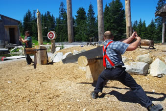 Toen we boven op Grouse Mountain waren, bekeken we nog een leuke Lumber Jack show waarbij twee mannen lieten zien hoe het vroeger toeging bij het kappen van hout en hoe behendig ze waren op een boomstam in het water.
