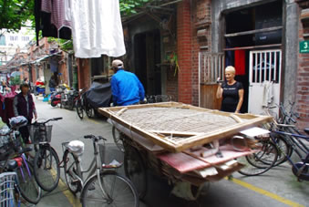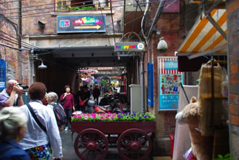 Toen we de warenhuizen daar zat waren, namen we de metro naar de Franse Concessie. Het is een uitgaanswijk die gerenoveerd is en wordt en als erfgoed beschouwd wordt maar waar je weinig Frans aan vindt. Hier en daar schiet er een rat voor je voeten weg als je tussen rommelig uitgestalde waar van de winkeltjes laveert. In de kleine straatjes speelt het leven zich veel buiten af en er zijn leuke kleine restaurantjes waar we natuurlijk ook even een kunstig gemaakte cappuccino moesten drinken.
