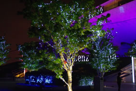 Sprookjesachtig verlicht met een torenflat op de achtergrond |