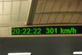 De bus bracht ons naar de magneettrein waarvan we dachten dat hij ons met een vaart van 431 km per uur naar het vliegveld zou brengen. Helaas ging hij maar 331 maar niettemin flitste het landschap aan je voorbij.
