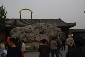 In de eerste sectie van het paleis vallen meteen de vijf rotsen op. Vier rotsen symboliseren de seizoenen, de vijfde rots is een heel grote met de naam “Geldverspilling”. Ze moest en zou de rots daar hebben. Deze paste niet door de poort die speciaal moest worden afgebroken en herbouwd. In geld verspillen was ze erg goed, ze was ook niet erg geliefd. In een van de gebouwen staat de troon met daarachter een spiegel met veel woorden. Het zijn allemaal herhalingen: Lang Leven en Lange reis. Voor het gebouw een feniks (keizerin) en een draak (keizer). Aan de andere kant staan beelden van de leeuw, os, draak en hert. Zij moeten met hun eigenschappen de geesten weren. Zoals overal bij de belangrijke gebouwen zie je een soort theepotten van brons. Daarin werd wierook gebrand vanwege de geur.