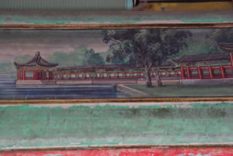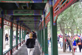 Als je over een lang overdekt pad loopt, zie je prachtige beschilderingen; er zijn er wel 40 .000. het pad is 700 m lang. In het midden passeer je de ingang van de toren en aan het eind kom je bij een marmeren boot. Zij heeft die laten bouwen met geld dat voor de oorlog bedoeld was. De oorlog is dan ook verloren.