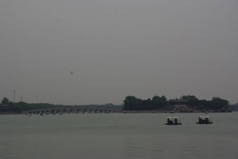 Als je over het meer uitkijkt zie je een brug met 2x9 bogen. Voor de Chinezen is 2x9 blijkbaar 17, want zoveel bogen telde ik. Maar bedoeld wordt dat er één grote boog in het midden staat en als je van buiten naar binnen telt is het telkens de 9e. De Chinese fantasie zegt ons ook dat je een schildpad moet zien. Het eiland is het lijf en de brug is de nek. De brug is 150 meter lang en je ziet er meer dan 500 verschillende leeuwen.