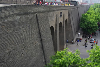 Vandaag bezochten we de stadsmuur. Hij is 14 km lang en gerestaureerd. Hij is 600 jaar oud, gebouwd tijdens de Ming dynastie. Eerst wierp men een grote aarden wal op om hem later te bekleden met stenen. Door de jaren heen is hij redelijk intact gebleven. Als je over het loopvlak van de muur heen kijkt, zie je hoe dat komt, hij golft. Daardoor loopt het regenwater overal naar beneden en wordt in sleuven aan de zijden van de muur naar beneden geleid.