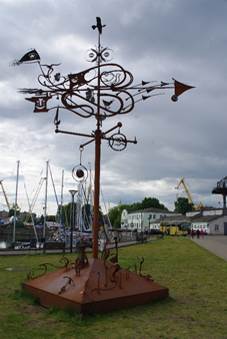 Als snel liepen we tegen een paar andere beelden aan. Het eerste stelt de kracht en macht voor van de elementen en wel speciaal de wind. Het heet ook Wind. Even daarna zagen we het beeld Vier Winden, gemaakt door een team van smeden in het internationale smidstoernooi in 2017.
