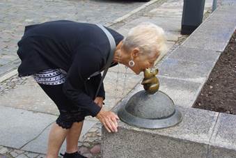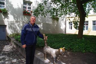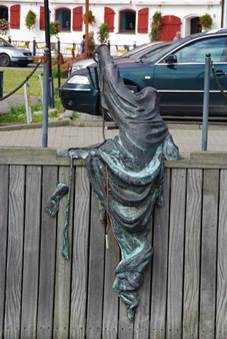 De volgende drie sculpturen zagen we langs de oever van de rivier. De eerste was die van een zeemeermin als symbool voor Klaipeda als stad van de zee ofwel ze treurde vanwege een omgekomen strijder. Er wordt gezegd dat als de rivier stroomt er een beeldschone dame met een prachtige staart tevoorschijn komt.