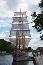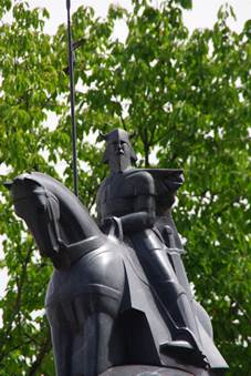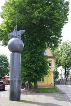 Achter ons was een brug met daarachter een prachtig oud schip. In de buurt van dat schip vonden we weer wat bijzondere beelden. Niet ver van het schip stond een beeld van een strijder. Dit beeld symboliseert het feit dat het 1000 jaar geleden was dat er voor het eerst over Litouwen geschreven werd.