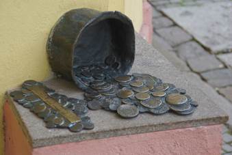 Het laatste beeldhouwwerk op die plek was de mand met munten. Het gele huis dat je bij de strijder ziet is het eerste register voor spaarmunten dat gebouwd werd in 1915-1916. De munten zijn allemaal verschillen, van vorm, grootte en komen uit verschillende landen. Dit symboliseert dat Klaipeda een havenstad is waar het geld komt dat voortvloeit uit de handel met andere landen.