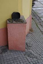 We liepen door een oud straatje met zoals overal kinderkop keien. Er was haast niet op te lopen. We kwamen uit bij een plein met vier beelden. Twee ervan zie je op de foto. De eerste betekent Wachten en de tweede, een vingertop met nagel, betekent Let op!