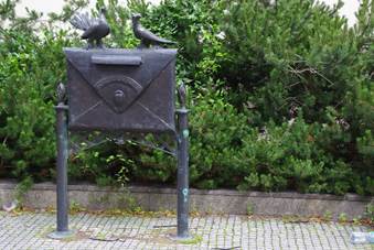 Voor we naar het schip terugkeerden, zagen we de plattegrond van de oude stad van Klaipeda afgebeeld op een gevel met daaronder De Oude Brievenbus. De brieven bus heeft nog steeds een functie. Hij dient als ideeƫnbus. Je mag er ook een papier met leuke suggesties, wensen of complimenten in gooien