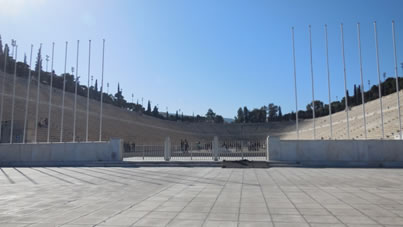 Het was niet zo ver naar het centrum van Athene en onderweg babbelde onze gids voluit. Onze eerste stop was bij een indrukwekkend stadion. Het was het eerst moderne stadion voor de Olympische Spelen in 1896. |