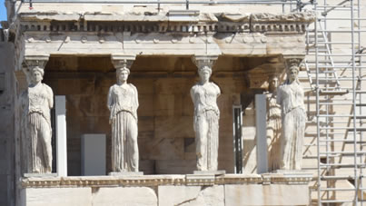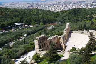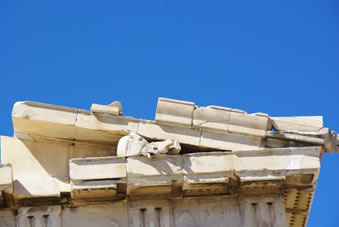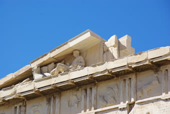 Ook de tempels hier zijn gewijd aan de goden. Het beroemdste bouwwerk, het Parthenon is een tempel die gewijd is aan de maagdelijke Athene. De tempel heeft Dorische zuilen die allemaal een beetje naar binnen leunen. Bovenin zie je altijd een mens en een paard. Alles is gebouwd van marmer en als je vanaf de rots kijkt naar de plek waar al dat marmer vandaan moest komen, verbaas je je wel over hoe ze het in hemelsnaam voor elkaar hebben gekregen om die zware blokken over die grote afstand te vervoeren en daarna nog op de rots te krijgen ook.