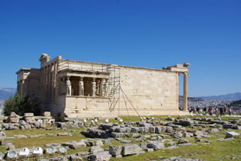 Ook beroemd is het Erechteion. Dit gebouw is geweid aan Poseidon en Athene. De mensen gaven constant van alles aan de goden. Er is maar een keer het omgekeerde gebeurd; de goden schonken iets aan de mensen. Poseidon sloeg met zijn staf op de grond en er ontsprong water; het gat waar dat uit kwam, is nog te zien. Athene sloeg met haar staf op de grond en er ontsproot een olijfboom, die er nog staat. De mensen moesten toen kiezen wat de beste gave was. Een vrouw mocht natuurlijk niet winnen dus won Poseidon, maar Zeus beval een herstemming en die werd met één stem verschil door Athene gewonnen. De stad werd vervolgens naar haar vernoemd, Athene. Op de plek waar op de grond gestampt was, is het Erechteion gebouwd met prachtige ionische zuilen.