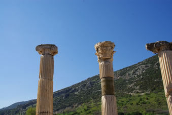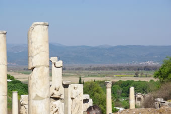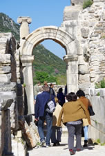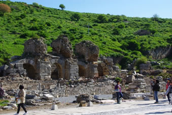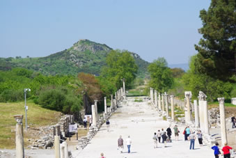 We zijn aangekomen in Ephesus, een stad die deel heeft uitgemaakt van het Ionische koninkrijk en later ook van het Oost Romeinse Rijk ook wel het Byzantijnse Rijk genoemd. Het was in de 11e eeuw BC opgericht door koning Andropoulos. Het was op dat moment de beste plek om een stad te stichten. Het was een vruchtbaar gebied, er was veel schoon water en strategisch gelegen voor de handel. Het was dan ook een havenstad, heel dicht bij de zee, die zich tegenwoordig 8 km teruggetrokken heeft. Als je uitkijkt over de voormalige havenstraat kijk je op de plek waar het toen zee was. Op een heuvel in de verte zie je een fort dat ook dienst deed als vuurtoren voor de zeevaarders. In de 4e eeuw BC gebruikten ze nog steeds het geld uit dit Ionische keizerrijk. Na het Ionische tijdperk werd het veroverd door de Perzen en heerste koning Darius. Deze voerde oorlog met Alexander de Grote en vanaf 336 BC behoorde dit gebied tot het Oost Romeinse Rijk. De stad staat in een tektonisch gevoelig gebied en is al 7x verwoest door aardbevingen waardoor je er alleen nog maar Oost-Romeinse gebouwen vindt.