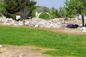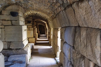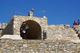 Even later bevonden we ons in het Odeon, de muziek arena. Er pasten 1500 mensen in. Bovenin zie aan de ene kant de ingang voor het gewone volk en aan de ander kant de uitgang. Beneden waren twee marmeren poorten als in- en uitgang maar dan voor de rijken. |