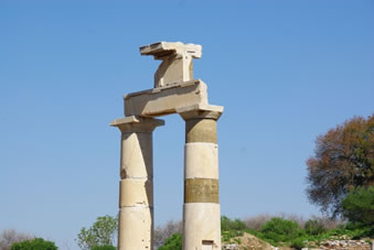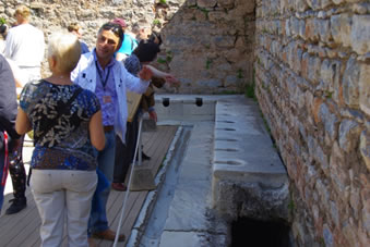 Plotseling staan we voor de restanten van een fontein uit de tijd van de heerser Trajan. Onder de boog waar het water uit liep zien nog wat restanten van het beeld, een grote voet en een bol. Er wordt gezegd dat in de 1e eeuw BC men al wist dat de aarde rond was. Trajan staat hier met zijn voet op de wereld om te laten zien dat hij de baas over de wereld is. Het water van de fontein loopt door een goot naar de zee.