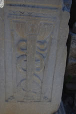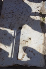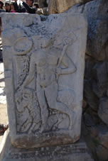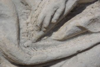 Op een blok marmer zie je nog goed het teken van Aesclepios afgebeeld met de slang om de staf gekronkeld, hier een toorts, de huidige esculaap. Op de andere zijde staat Hermes, een zoon van Zeus en de bode der goden. Hij Had een ram bij zich als symbool van de handel. Aan zijn hielen zie je vleugels waarmee hij kon vliegen om pijlsnel de boodschappen over te brengen. |