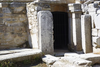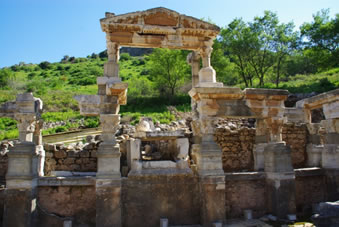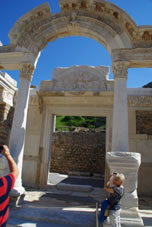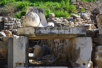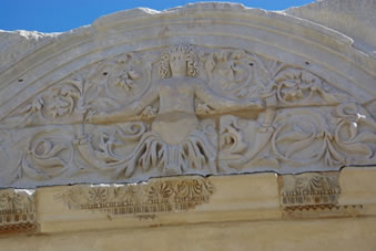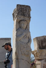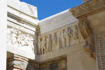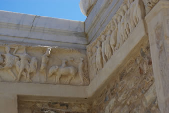 Dan komen we bij een fantastisch bouwwerk. Bovenaan bij het fries zien we Artemis (godin van de jacht) en Apollo (god van de zon). Beneden zie je vier beelden waarbij iets in het marmer gebeiteld staat. Van links naar rechts wijsheid, wetenschap, maagdelijkheid en geluk. Het was de bibliotheek. |