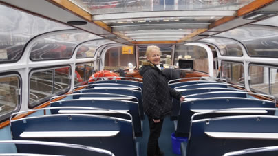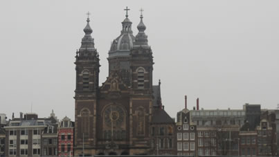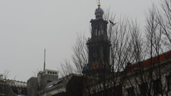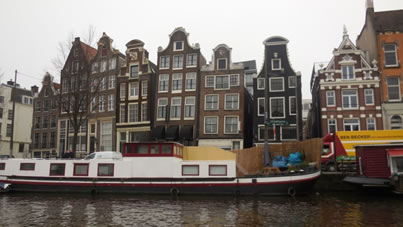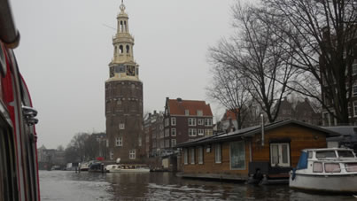 De oude huizen in Amsterdam zijn gebouwd op houten palen, ook de pakhuizen en het is echt een schitterend gezicht als je door een paar van de 100km Amsterdamse grachten vaart onderbroken door 1000 bruggen en 16 sluizen. In de verte hadden we nog zicht op een van de torentjes van het Rijksmuseum. |