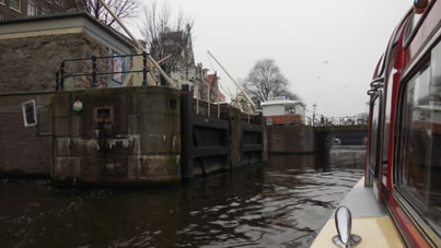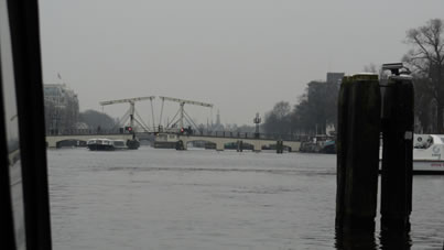 Toen langs de Dansende huisjes omdat ze zo scheef staan en langs de Hermitage, een vroeger bejaardenthuis (tegenwoordig museum) voeren we de Amstel in met in de verte de Magere Brug. De huidige witte houten ophaalbrug is niet de eerste brug daar. De eerste stamde uit 1692 en was heel smal, vandaar de naam Magere Brug. |