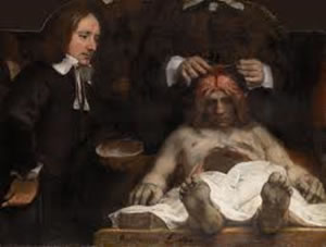Hij mocht de vijf heren van het lakengilde, de Staalmeesters, schilderen maar hij moest zorgen dat ze er goed en duidelijk op stonden. Dat waren immers de foto’s voor die tijd. Als je eens in het Rijksmuseum ben en je gaat naar het schilderij dan zie je ook hoe geniaal het geschilderd is. Waar je ook staat, de heren kijken je aan. Ze wilden er met strenge gezichten op maar toen het bijna klaar was, schilderde Rembrandt het prachtige rode tafelkleed dat een zachte gloed op hun gezichten tovert. Ga maar eens voor het schilderij staan en houd je arm zo dat je het tafelkleed niet ziet. Laat het even op je inwerken en je leest de gestrengheid van hun gezichten af. Haal daarna je arm weg en je ziet door het tafelkleed een verzachtende gloed op hun gezichten.