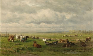 Tijdens onze tocht kwamen we langs schilderijen van de Haagse School. De kunstenaars toen zagen de schoonheid van de polder. Zij schilderden landschappen met een wijde horizon en herkauwende koeien. Hierdoor ontstond het beeld van Nederland als een groen vlak polderland onder grijsblauwe luchten. Niet alle schilders van de Haagse school gaven dit beeld weer. Dat zie je aan het schilderij “Een molen aan een poldervaart” dat bekend staat onder de naam “In de maand juli”. De schilder, Paul Gabriel, schreef: "Ons land is niet grijs, de duinen zijn niet grijs, zelfs niet bij grijs weer." Hij schilderde graag mooie zomerdagen maar hoewel hij duidelijk behoort tot de Haagse school zie je dat hij meer kleur aan de luchten geeft.