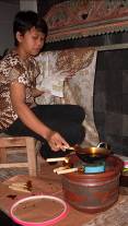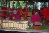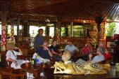 De bus bracht ons aar een prachtig restaurant in Boeddhistische /Hindoe stijl. Deze twee godsdiensten zijn hier toch tamelijk verweven. Je ziet het soms ook aan de Hindoe bouwstijl die vaak stupa-achtige vormen vertoont. Tijdens de maaltijd werden vergast op traditionele Javaanse muziek. Later kwamen er ook nog zangeressen bij. Sommigen vonden het mooi maar voor mij was het wel leuk maar het leek wel of ze steeds dieper in de ellende verzonken. Vol gegeten brachten we een bezoek aan een batik werkplaats. Batikken is een erg arbeidsintensief proces. Op het doek, katoen of zijde, wordt een tekening aangebracht. In dit geval waren het tekeningen van de meester. Vervolgens worden lijnen en vlakken gevulde met was. De hete was wordt in een klein trechtertje gedaan dat aan een steeltje vastzit. Zo brengen ze de was aan. Vervolgens wordt het doek in een kleurstof gewassen.