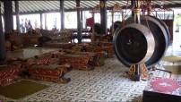 Onderweg naar de tempel zag ik nog een huis waar werkelijk mensen in wonen en een huis in aanbouw. Het bamboeskelet staat al. Mijn taxi reed naar de verkeerde ingang en de bestuurder moest toen de anderen gaan zoeken. In ieder geval is zijn conditie behoorkijk toegenomen na dit ritje met mij. In de tempel weren we rondgeleid door een archaïsch Nederlands sprekende oudere man. Het was interessant om te horen en we zagen prachtige kunst- en bouwwerken, kristallen kroonluchters, muziekinstrumenten. De voorlamp van de fiets zal de ouderen onder ons nog wel bekend voor komen.