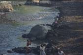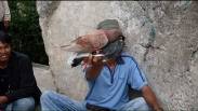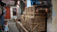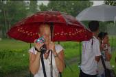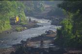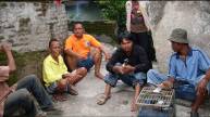 De duiven die hier verkocht worden, keren nadat ze door de nieuwe eigenaar zijn vrijgelaten, weer terug. Waarom ze verkopen, is me ontgaan. De koper zal dit ook wel weten. Het zal wel geluk brengen, net als het houden van een vogel in een kooi. Tijdens het typen van dit verslag valt ineens de stroom uit. Geen internet meer, stilstaande watervallen, koelkasten en airco’s die niet meer werken. Maar dat gebeurt hier vaker. Na dit gebeuren luchtten we eerst op een prachtige plek, gelardeerd met muziek en toen op naar de Prambanan tempel. Toen we dichtbij waren, begon het zo verschrikkelijk hard te regen dat we dat excursie afbraken . De volgende dag zouden we terugkomen. Mijn sandalen konden niet zo goed tegen het feit dat ik in 15 cm hoog water liep en gaven de geest. Gelukkig had Lucia de tegenwoordigheid van geest gehad om twee paraplu’s te huren voor een paar duizend roepia’s waardoor het grootste deel van ons droog bleef. De volgende dag verlieten we Yogyakarta om op weg te gaan naar Bandung. Onderweg bezochten we tempel nogmaals. Je ziet heel goed de stupa-achtige vormen in de Hindoetempels terug. Op dit terrein staan ook Boeddhistische en Hindoetempels vlak bij elkaar. In het verkeer zie je ouders met kinderen tussen zich in op een motor rijden, bijvoorbeeld een zuigeling in een doek en een peuter er tussenin of voorop. In de rivier werd hard gewerkt; stenen verzamelen, wassen en ook je behoefte doen. Later onderweg naar Bandung prachtige landschappen met vulkanen op de achtergrond. Dat is niet zo moeilijk want deze archipel is een zeer seismisch actief gebied.