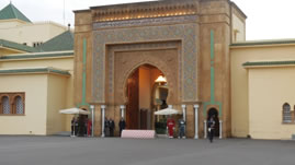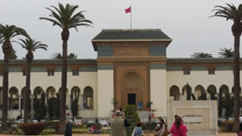 Na de medina reden we door de ville nouvelle met de typisch Franse bouwstijl: winkelgalerijen beneden en daarboven de woningen. We reden naar het koninklijk paleis van Mohamed VI. Het stamt uit de 18e eeuw en is gesticht door de oppas van de koning. Het is overgegaan van koning op koning. Een aantal van daken van de gebouwen is in piramide vorm gebouwd .