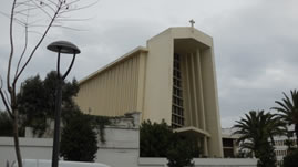 Niet lang daarna bezochten we een katholieke kerk, gebouwd in de jaren 20 van de vorige eeuw. Aan de buitenkant is het niet bijzonder en de akoestiek binnen houdt ook niet over. Het is alleen een recht middenschip, niet in de karakteristiek kruisvorm van de plattegrond van een katholieke kerk. Heel mooi is wel het glas in cement werk. Ze hebben als het ware schilderijen gemaakt van brokken glas in cement die spelen met het licht van buiten en dat op karakteristiek wijze binnen de kerk tot uiting komt.