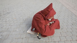 De kleding heeft geen bijzonder betekenis. Je ziet vaak mensen zomaar op straat zitten. Het is geen bedelaar.