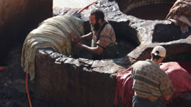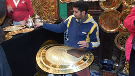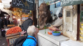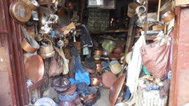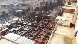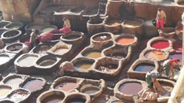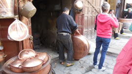 Met een flinke pas klimmen en dalen we door de smalle straatjes met veelsoortige en veelkleurige winkeltjes. We belanden bij een deel waar koperslagers aan het werk zijn en na een aantal steile trappen te hebben beklommen kwamen we bij de leerlooierij (waar ze ons natuurlijk ook lederwaren probeerden te verkopen, niet duur overigens). Deze leerlooierij bestaat al sinds de 9e eeuw en is een van de oudste bedrijven op dit gebied. Hij was eerst nog op een andere plek gehuisvest maar vanwege de stank en andere ongezonde dingen werd de boel verplaatst naar een plek die minder overlast veroorzaakte. Alle wordt met de hand gedaan, ook het verven van het leer.