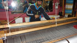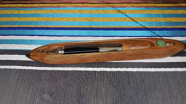 Hieronder zie je een weefgetouw. Met de voeten slaat hij de draden aan en als hij aan het touw trekt, gaat de schietspoel naar de andere kant. Als hij aan het andere touw trekt, gaat de schietspoel weer terug. |