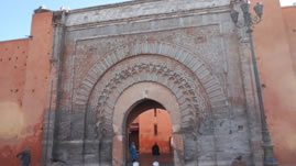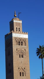 De volgende ochtend was het weer vroeg uit de veren en de bus bracht ons naar de medina van Marrakech. De besneeuwde toppen van het Atlasgebergte keken vanuit de verte op de achtergrond mee. Allereerst reden we naar de Koutoubia minaret, het symbool van Marrakech en gemaakt uit zandsteen. De drie ballen op de top waren vroeger van goud maar zijn nu van brons. De galg is bedoeld voor de witte vlag op vrijdag. Dat betekent dat er een dienst wordt gehouden.