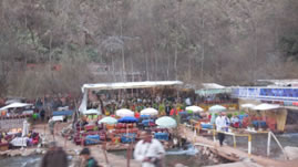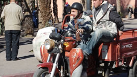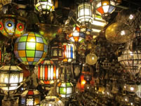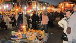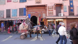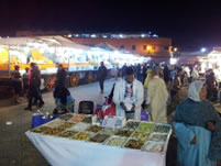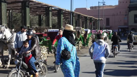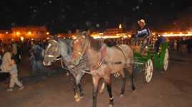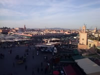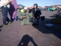 Daarna namen we een taxi naar het beroemde Djemaa-el-Fna plein, midden in de medina en volgens de reisgids het kloppende hart van de stad. En inderdaad, het lijkt wel of iedereen op dit plein rondloopt. Het is een enorm groot plein waar allerlei straatartiesten optreden, muziek, acrobatie, spelletjes, toneel, dansen, noem maar op. We liepen langs een lange rij paardenkoetsjes naar het plein. Het was een drukte van jewelste om alle artiesten heen. Even daar voorbij waren allerlei kraampjes met kruiden, voedsel, drinken. Ze proberen je allerlei mogelijke wijzen hun tent in te praten. Omdat ik een zin Arabisch kon uitbraken (Ma fiche fenous, mijn geld is op. Of het goed gespeld is, weet ik niet zeker), mocht ik gratis eten. De rest moest natuurlijk wel betalen. Maar ja, we hadden geen honger meer dus dat was geen optie. Een groot glas vers geperste jus d’orange was te koop voor nog geen €0,40. Na een poosje rondgeslenterd te hebben en de aankoop van lampjes en nootjes namen we na wat onderhandelen een taxi terug.