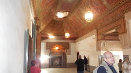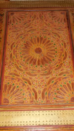 De vormen tezamen kennen wij in het woord arabesk. Vervolgens liepen we door allerlei gangen en over trappetjes het woongedeelte in, de harem. Harem betekent niets anders dan privé woongedeelte waar alleen het gezin komt en wat intimi. Het is een prachtige ruimte met een Italiaans marmeren fontein in het midden en een schitterend plafond van cederhout, versierd met bloemen. Je kunt je de woonkamer voorstellen met prachtige tapijten, zitkussens en ander meubilair. Om de woonkamer heen zijn de slaapkamers en de werkkamer van de koning gesitueerd.