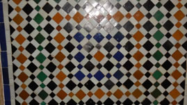 Tenslotte zagen we nog de geometrische decoratie waarin ook op briljante wijze tot uiting is gebracht dat God één is en overal. Je ziet in het midden één gekleurde tegel, daaromheen een vierkant van een andere kleur. Dat gaat zo oneindig door. Schitterend! |